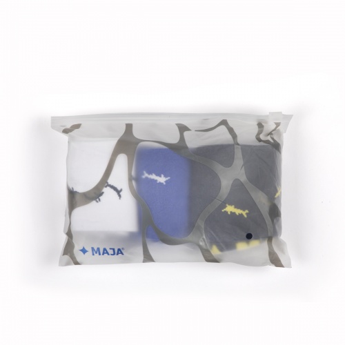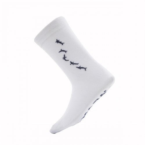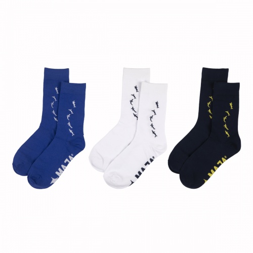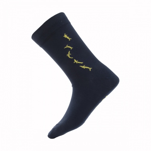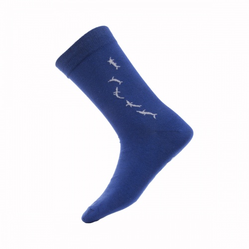 Completa tu look con nuestros calcetines inspirados en el salto del marlín, diseño en azul, negro y blanco.